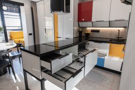 Настоящее произведение искусства – смесь красоты и смелых решений. У «Мондрианы» с этим полный порядок! Ее фасады создаются из МДФ и покрываются высокопрочным ультраглянцем. Ведущий цвет – белый, сочные акценты – красные, синие и жёлтые. Точь-в-точь как на полотнах голландского мастера абстракции! Кромки корпусов и фасадов выполнены в угольно-чёрном цвете, а столешница из искусственного камня – в цвете «звёздная буря». Контрастные кромки дарят кухне цветовую «глубину» и делают ее еще более выразительной.